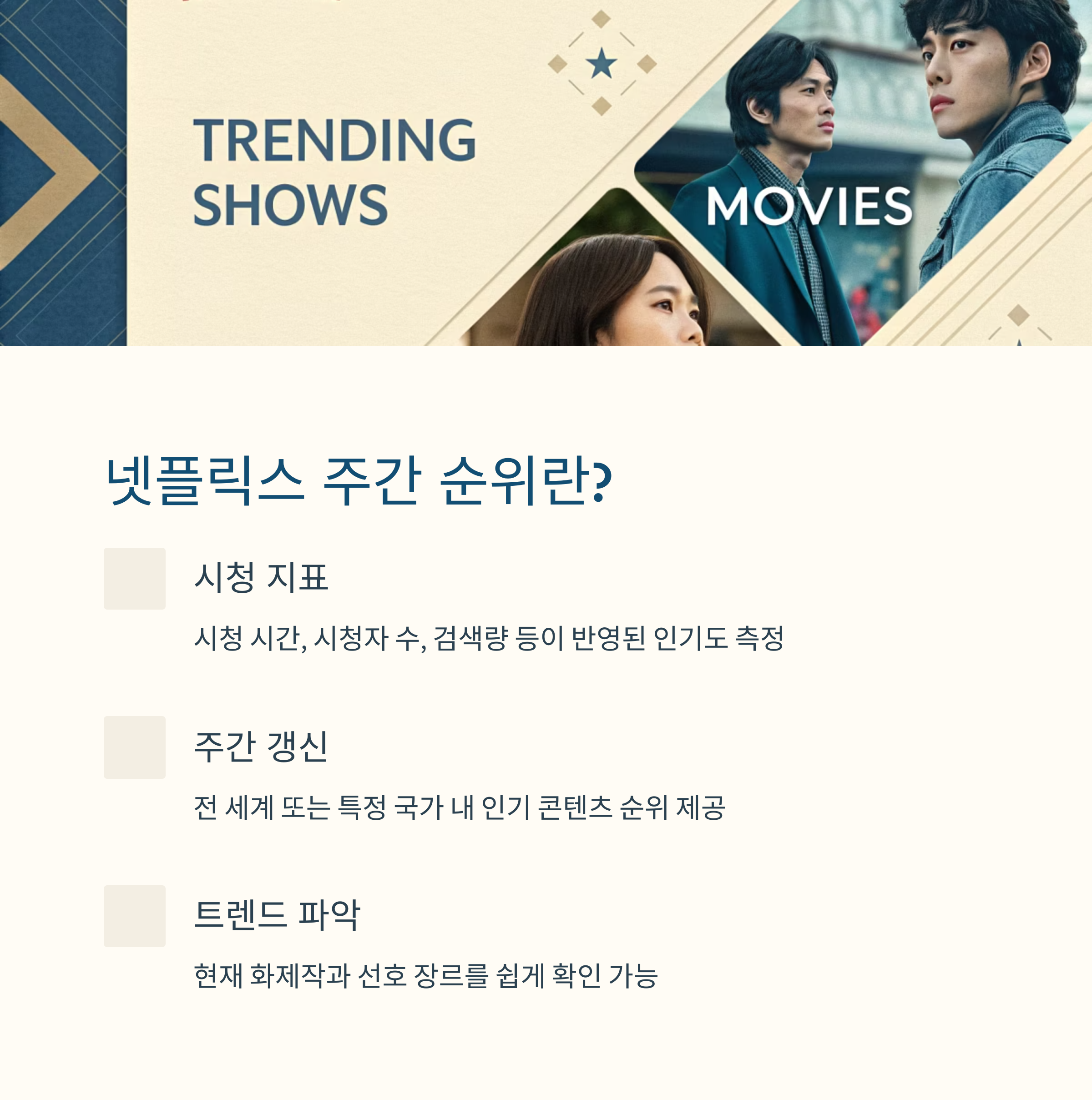 넷플릭스 주간 순위는 단순한 순위표가 아니라, 내가 다음에 무엇을 볼지 결정하는 데 큰 도움을 줍니다. 특히 신작이나 화제작을 빠르게 확인할 수 있어요.