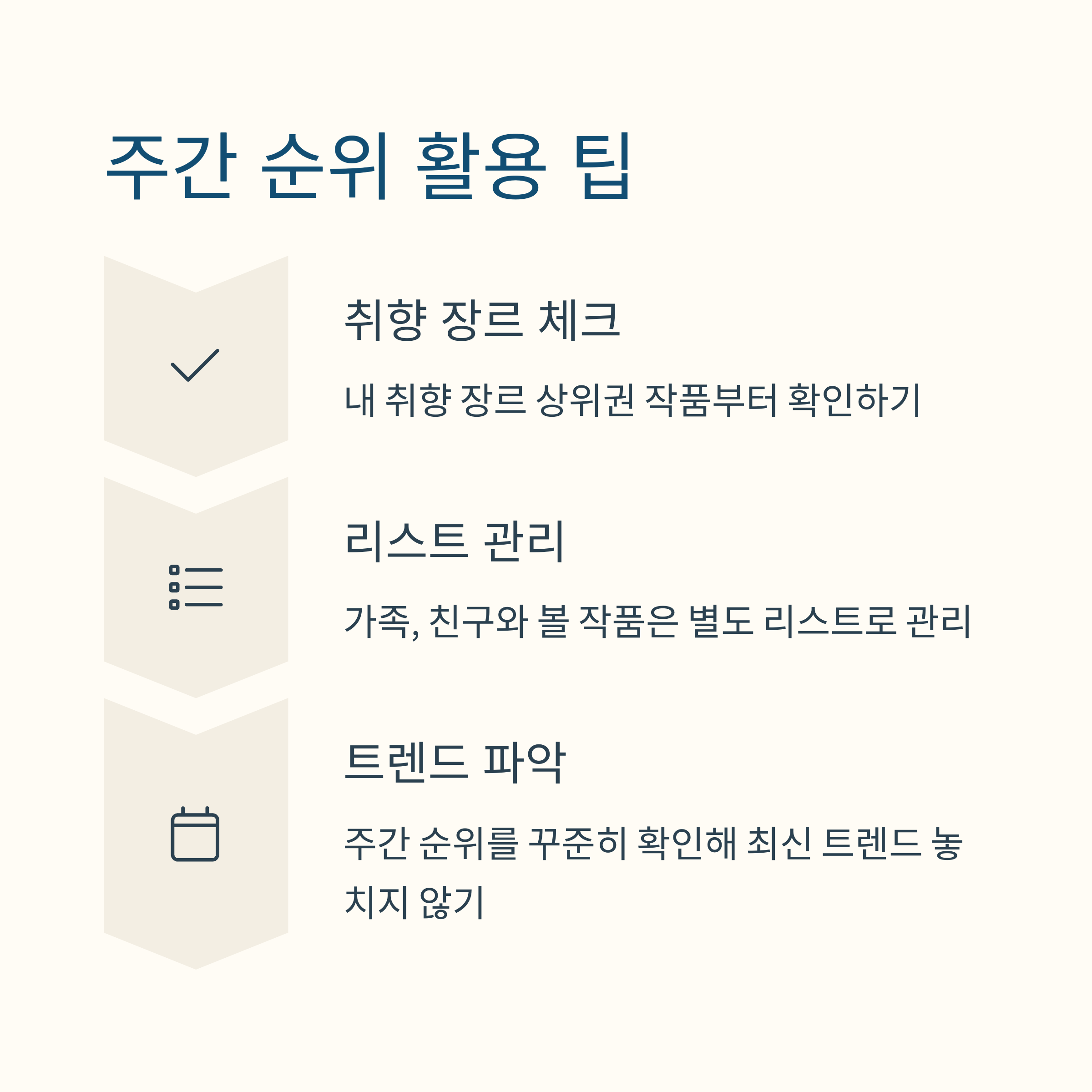 자신이 좋아하는 장르나 배우, 감독 이름으로 필터링하고, 관련 순위 콘텐츠를 꾸준히 체크하는 것이 효과적입니다.