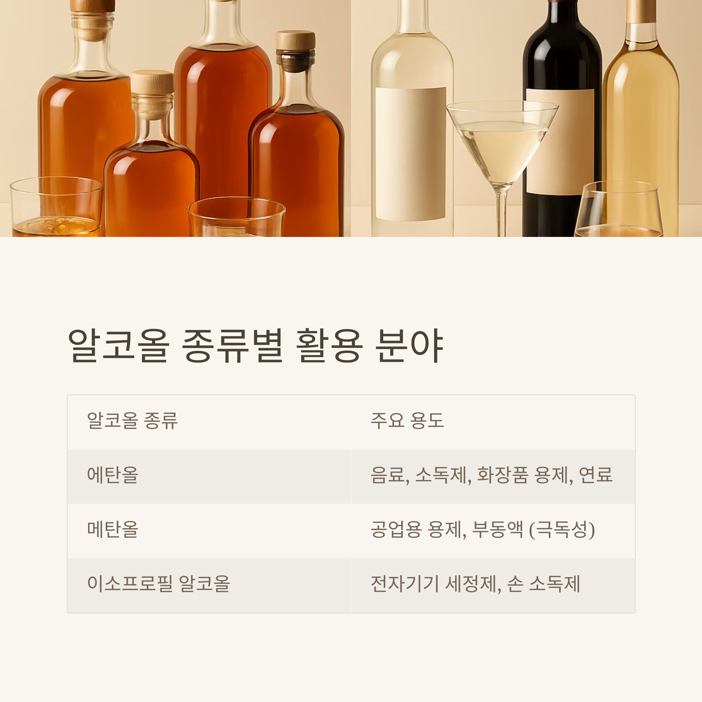 일상에서 우리가 접하는 알코올은 종류가 정말 다양해요. 특히 에탄올과 메탄올은 외형적으로 비슷해 보이지만 용도는 완전히 달라요. 아래 표에서 각각의 대표 알코올 용도를 비교해봤어요.
