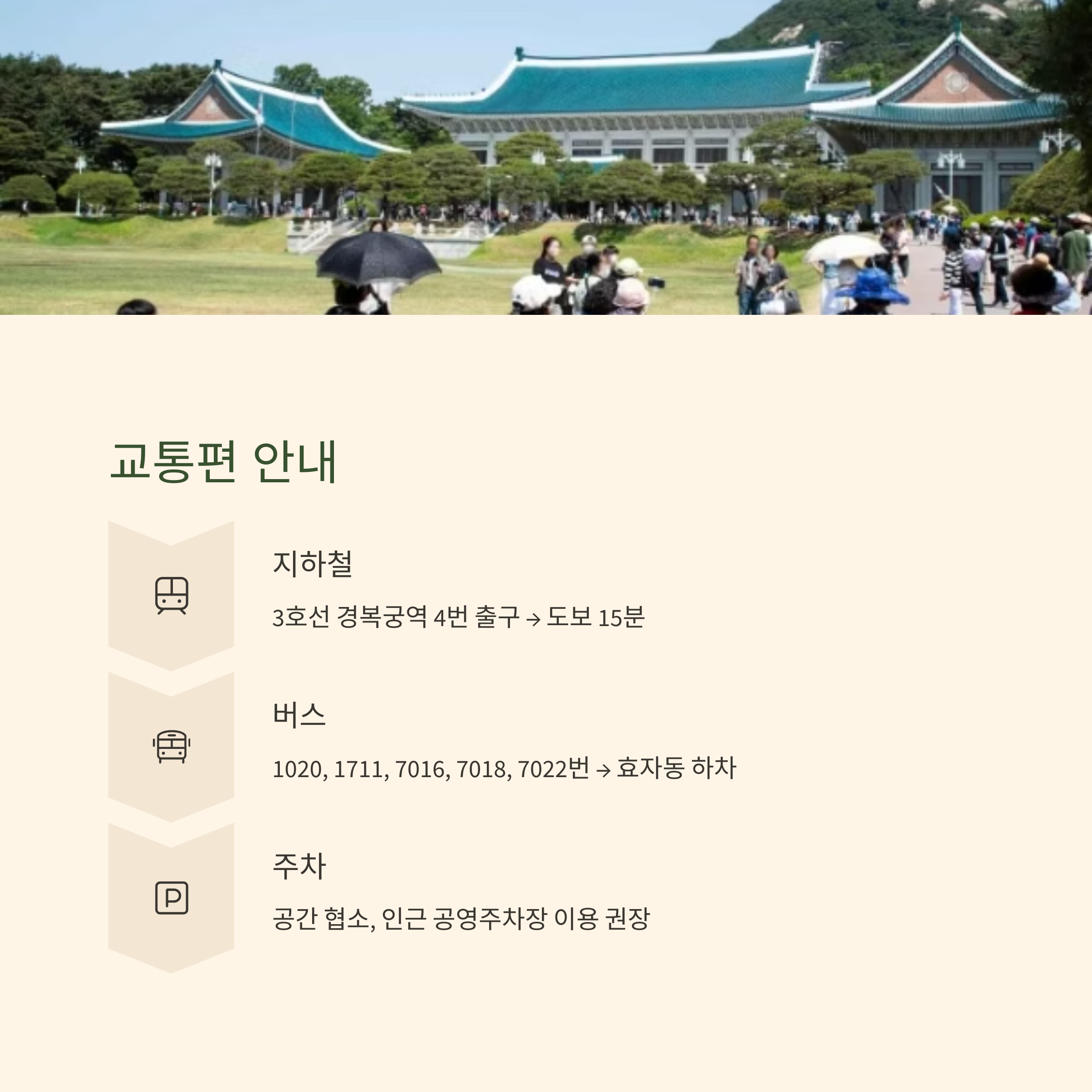 청와대 주변은 주차공간이 매우 협소하여 대중교통 이용이 권장됩니다.