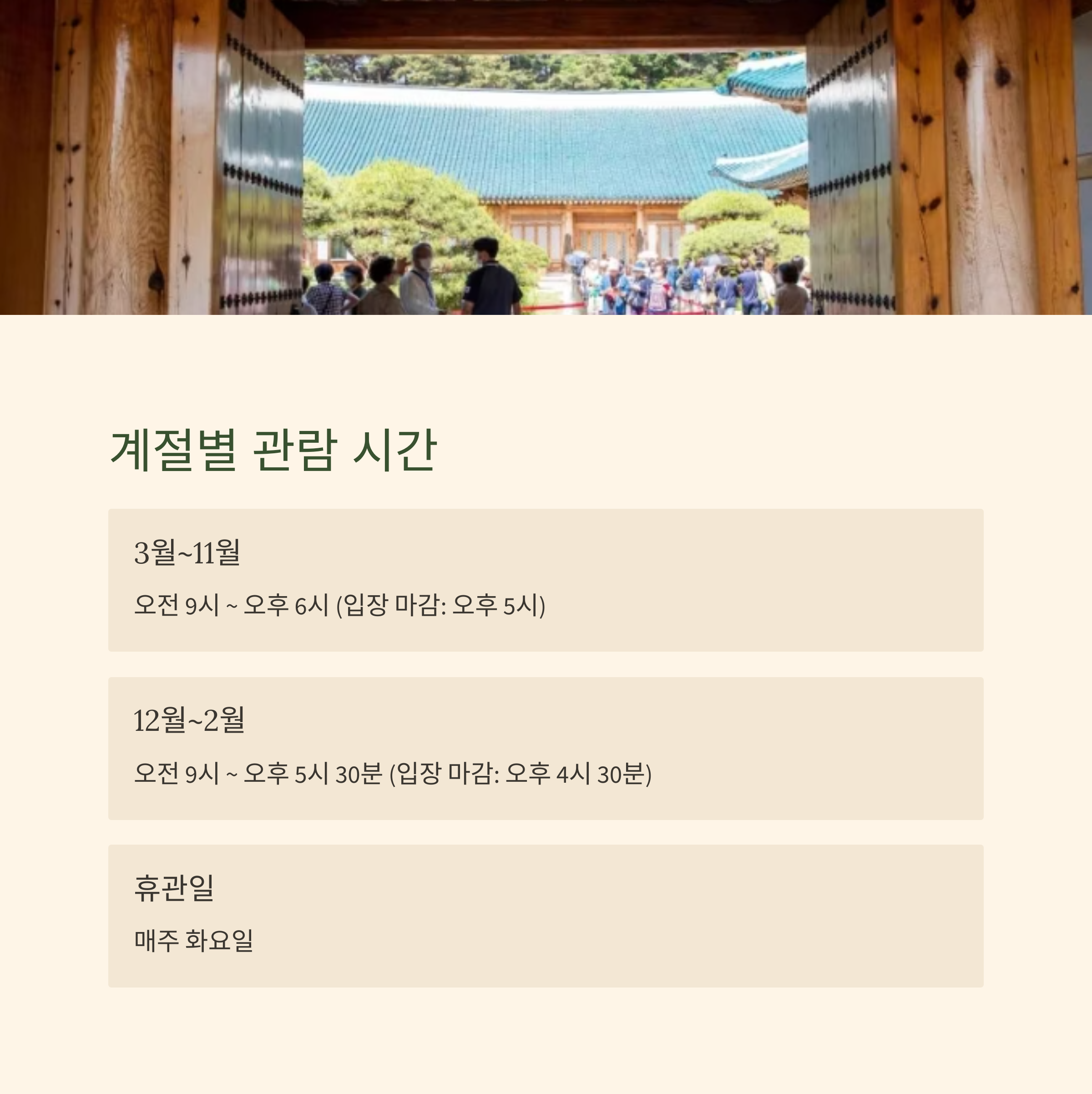 매주 화요일은 휴관일이며, 계절에 따라 관람 시간이 조정됩니다.