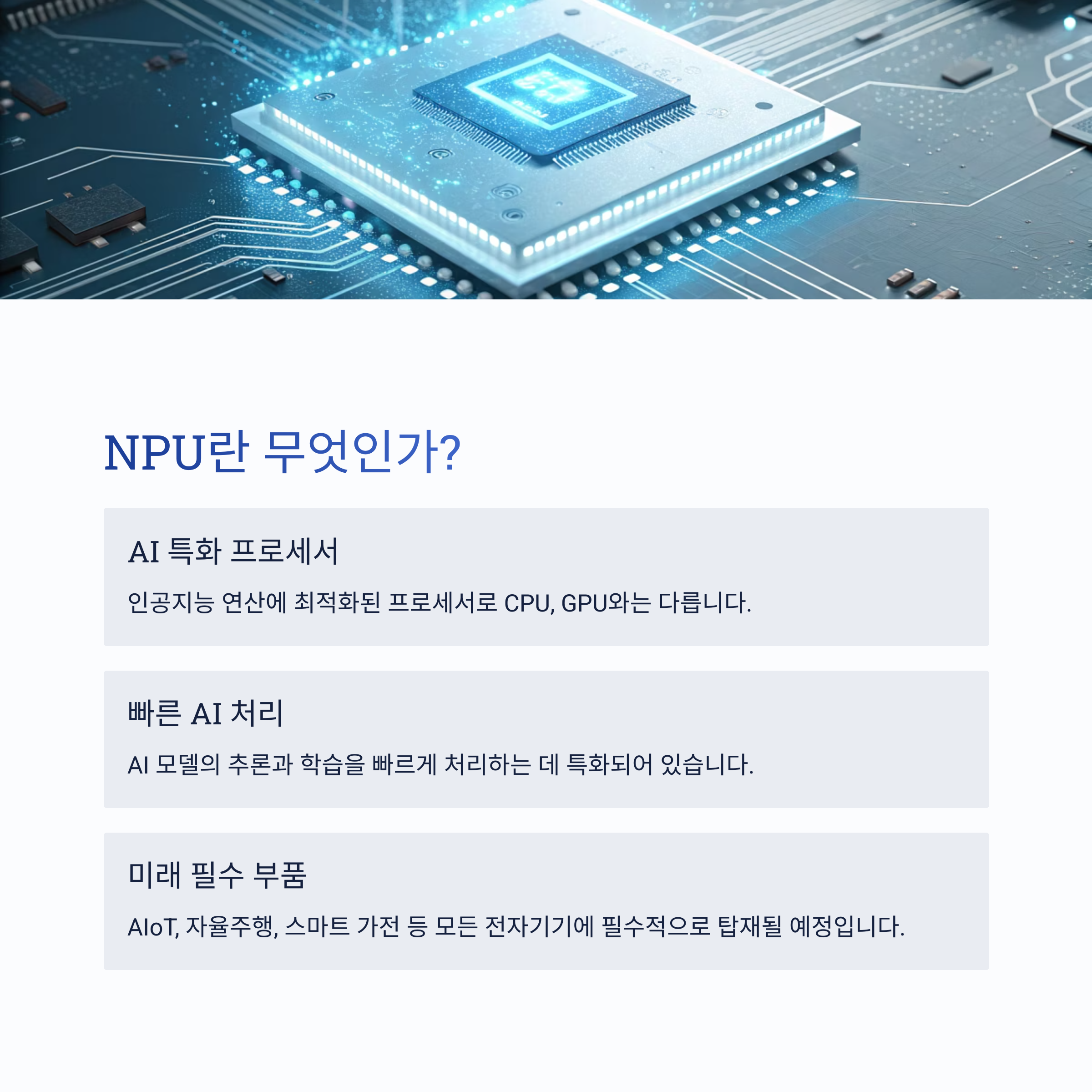 NPU는 Neural Processing Unit의 약자로, 인공지능 연산에 특화된 프로세서입니다. 우리가 알고 있는 CPU, GPU와는 달리, AI 모델의 추론과 학습을 빠르게 처리하는 데 최적화되어 있어요. 예를 들어, 스마트폰의 얼굴 인식이나 음성 비서가 빠르게 반응하는 것도 NPU 덕분입니다. 앞으로 AIoT, 자율주행, 스마트 가전 등 거의 모든 전자기기에서 필수적으로 탑재될 거라고 보셔도 무방해요.