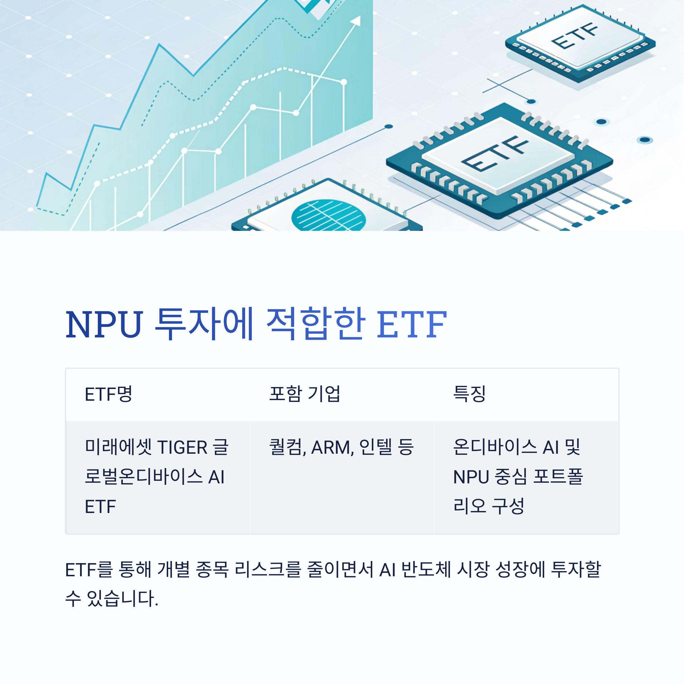 | 미래에셋 TIGER 글로벌온디바이스 AI ETF | 퀄컴, ARM, 인텔 등 | 온디바이스 AI 및 NPU 중심 포트폴리오 구성 |
